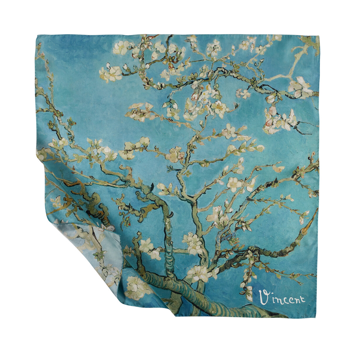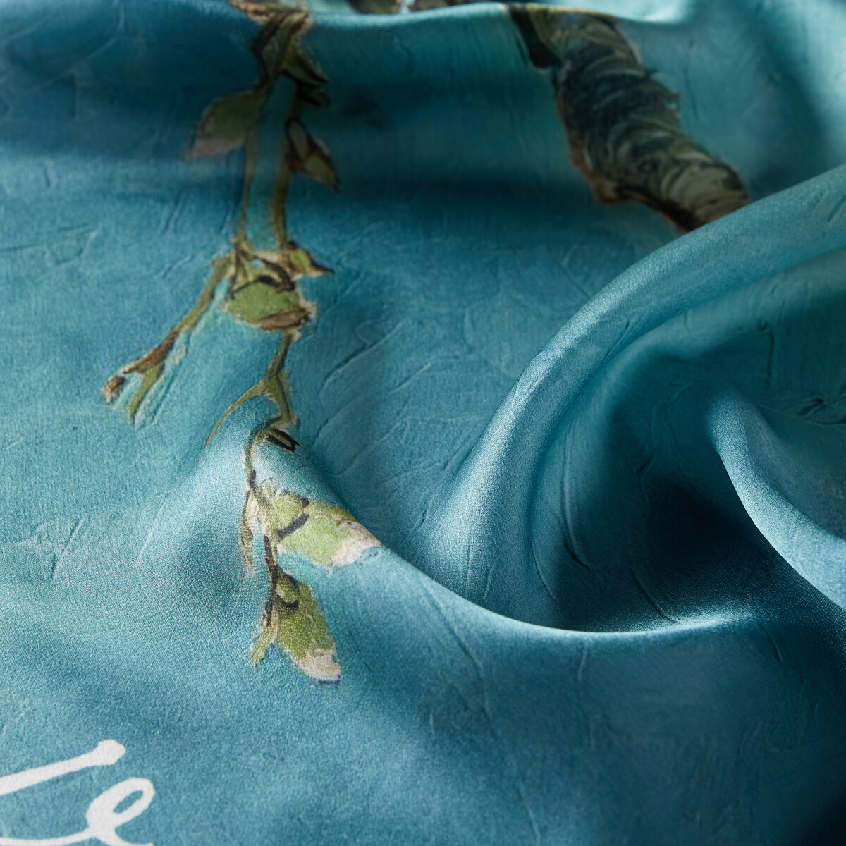A square scarf in silk twill digitally printed with Vincent van Gogh's meaningful 'Almond Blossoms' painting.