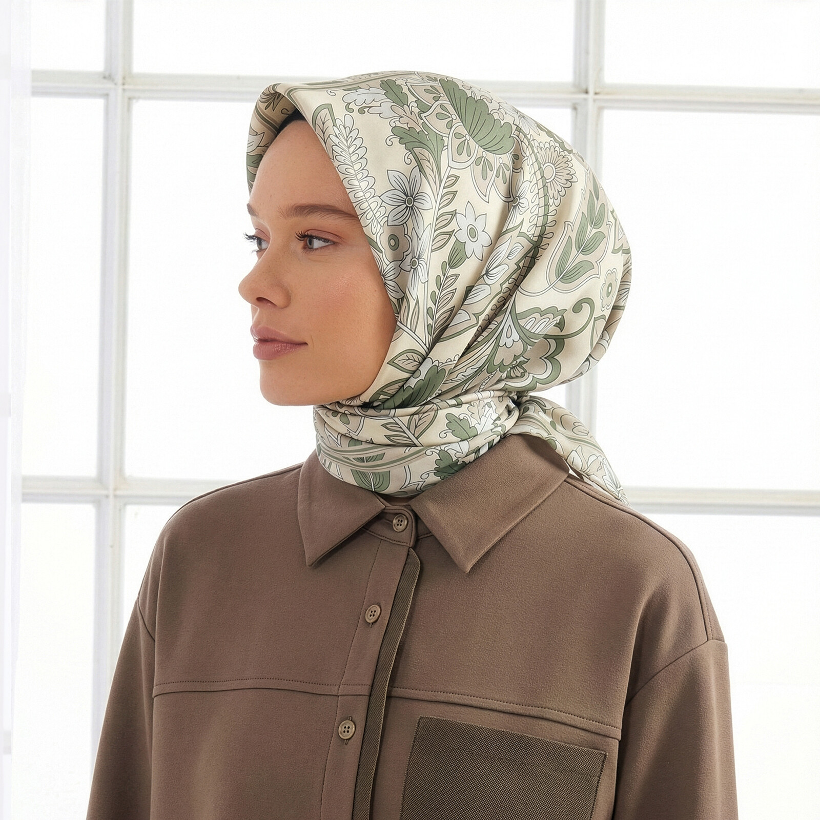 Bej Asi Sarmaşık Tivil İpek Eşarp