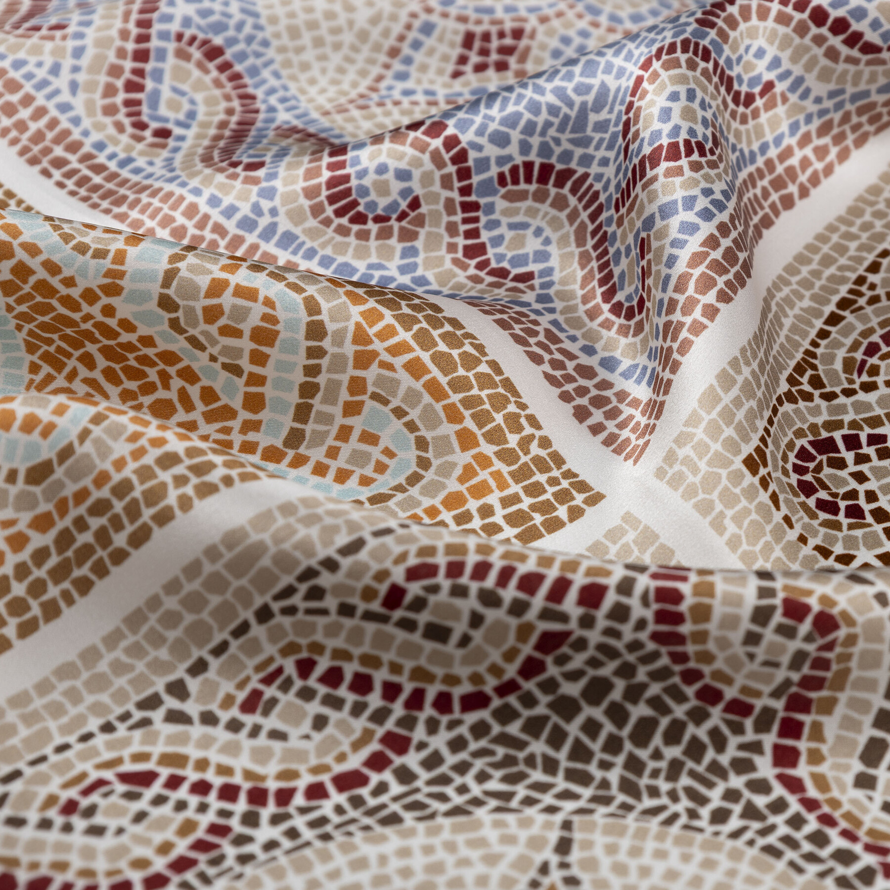 Kadim sanatın ve evrensel düzenin simgesi mozaik motifleri, tivil ipeğin zarif dokusunda hayat buluyor. Sadece bir aksesuar değil; desenlerinde saklı uyum ve ahenkle ruhunuza dokunan mistik bir yolculuk sunuyor.