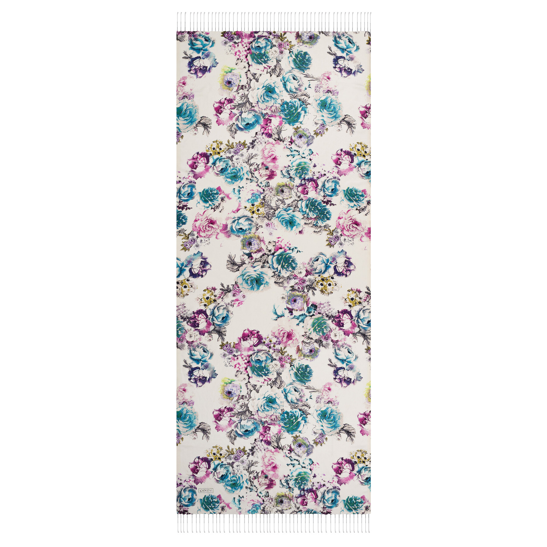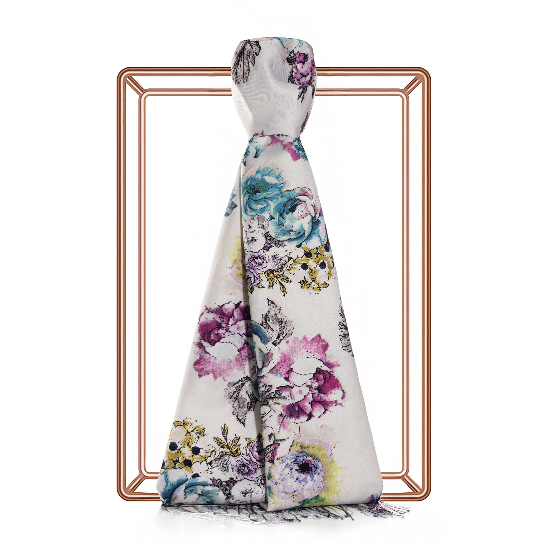 Beyaz Mentol Gül Deryası Desenli İpek Şal
