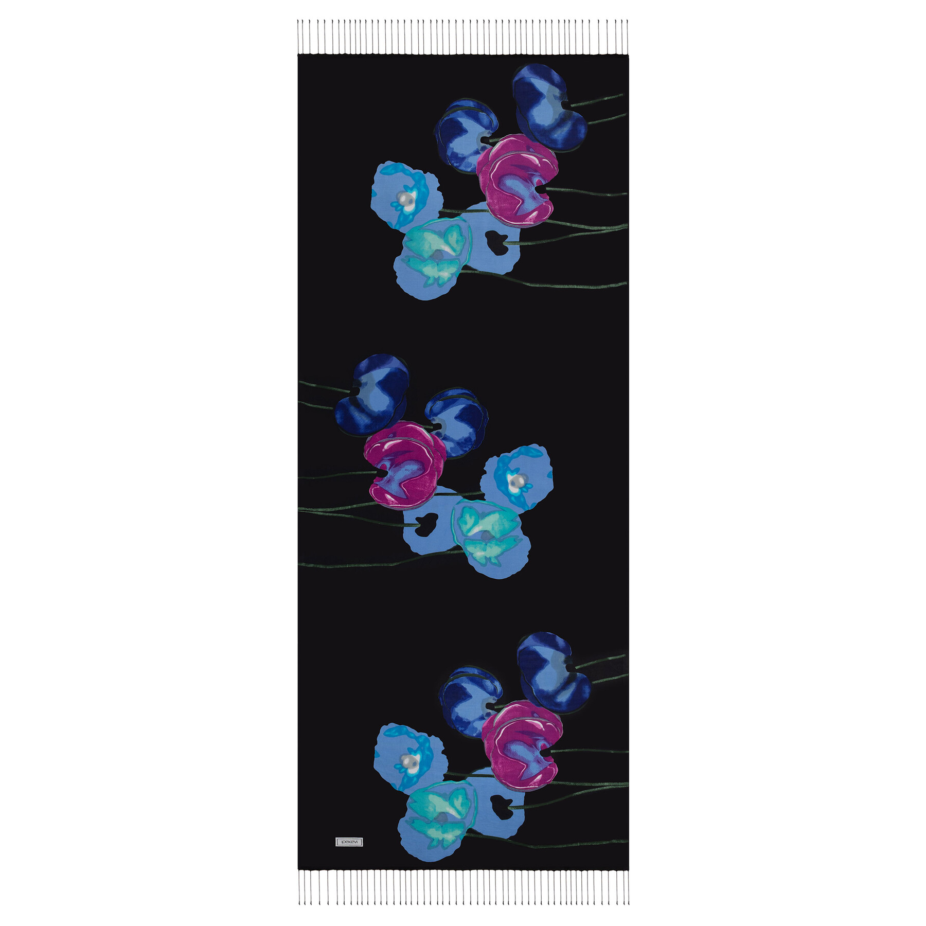 A black silk scarf featured with our iconic cherry looking Poppy print throughout.