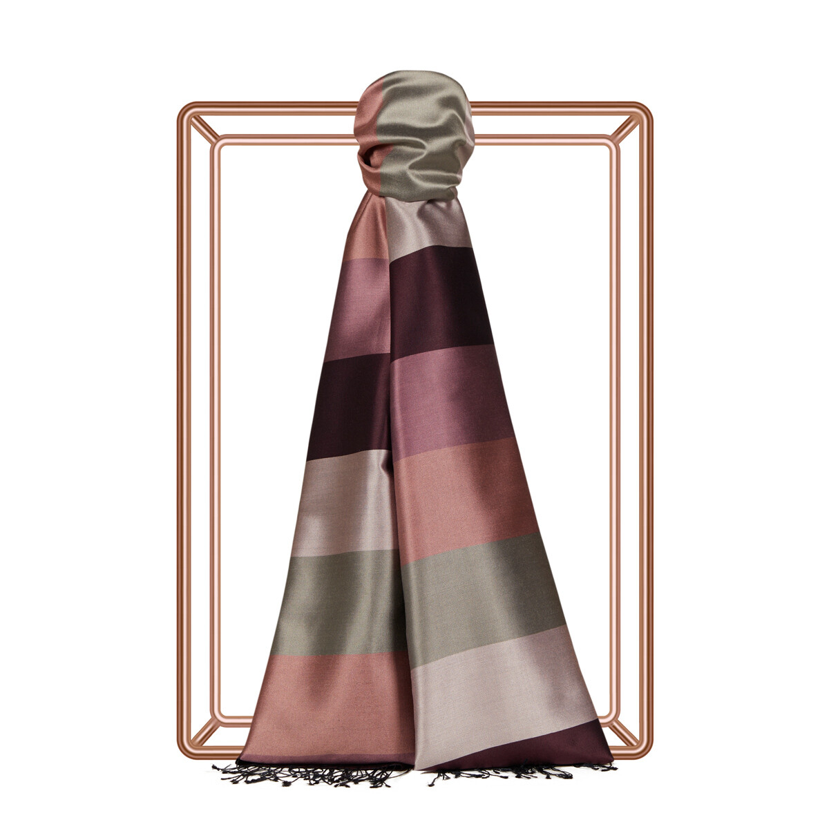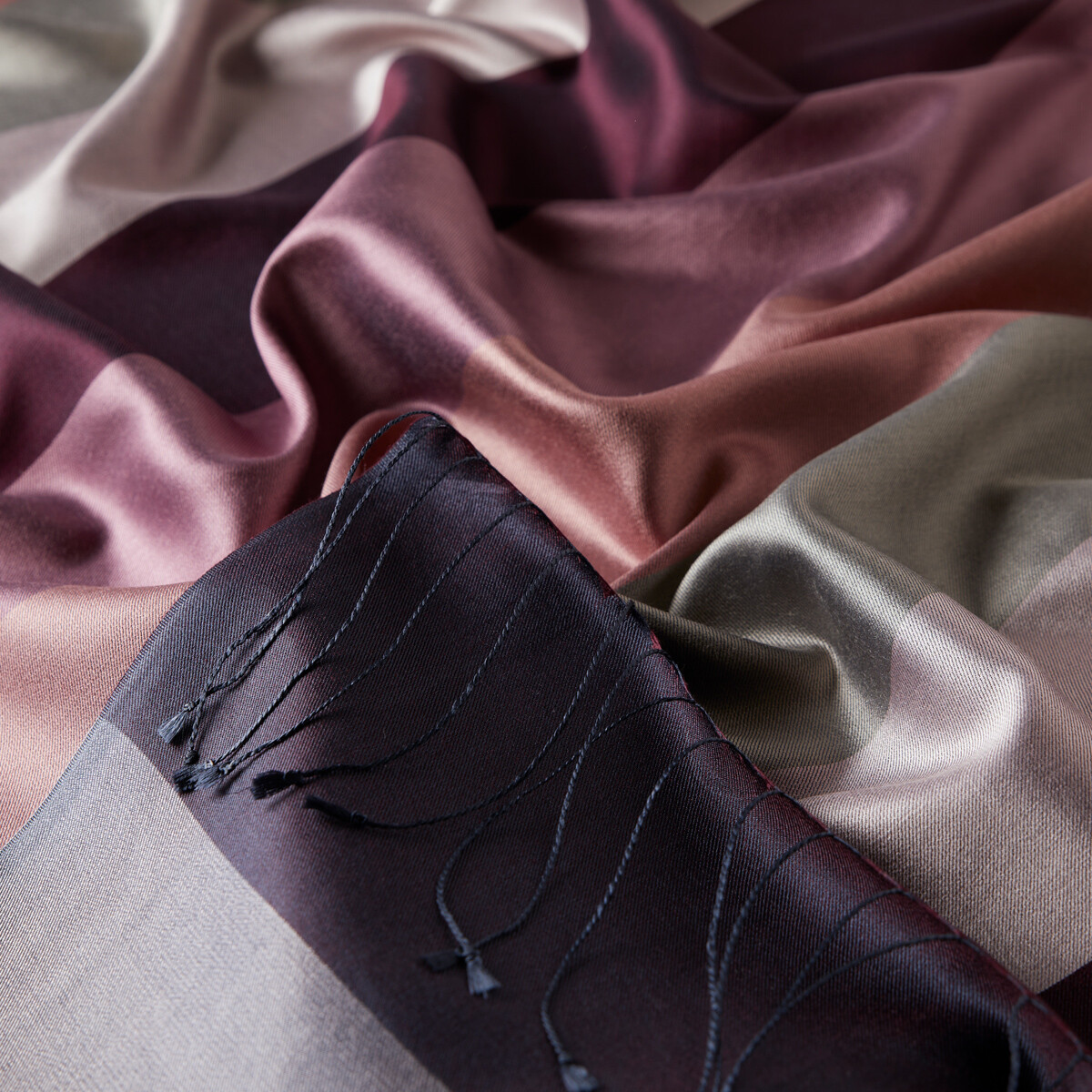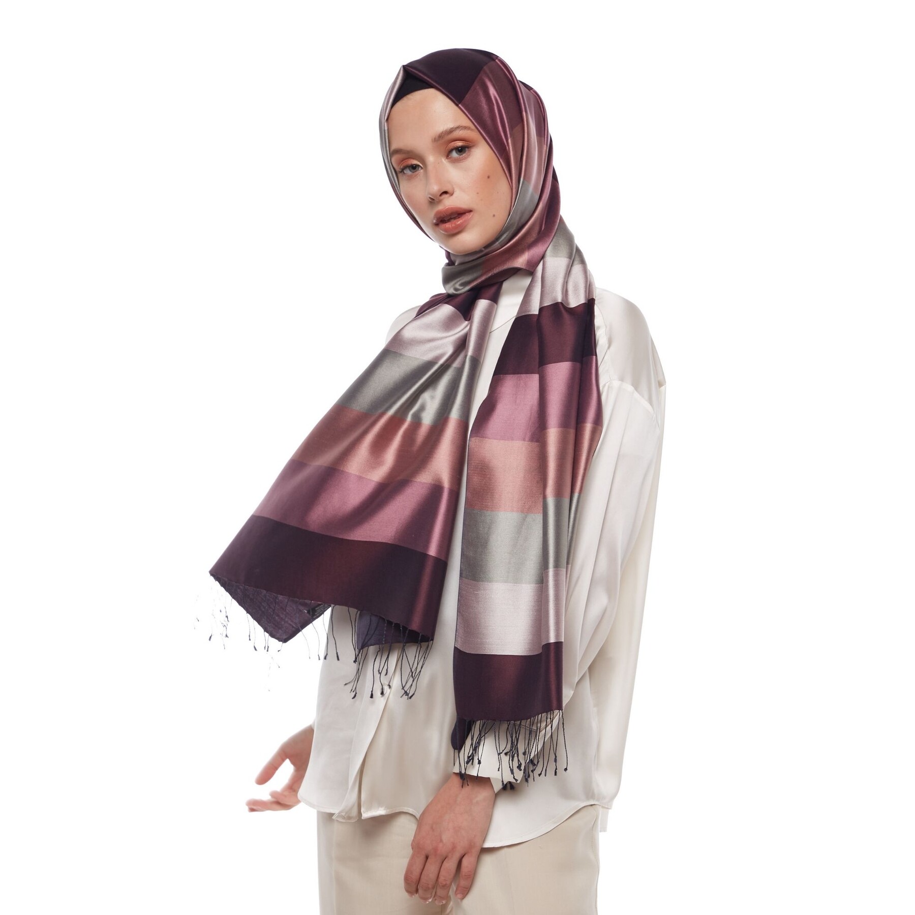الشالات المخططة الملونة المجهزة بألوان متناغمة مختلفة تتوافق مع بعضها البعض، تحمل معًا رموز الألوان الأكثر خصوصية لهذا الموسم. أبرز الأمثلة على الأناقة الرياضية هي المرشحة لتصبح من شالاتك المفضلة من تصاميم بيت الحرير. مجموعة هندسية.. 100% حرير 70×200 سم