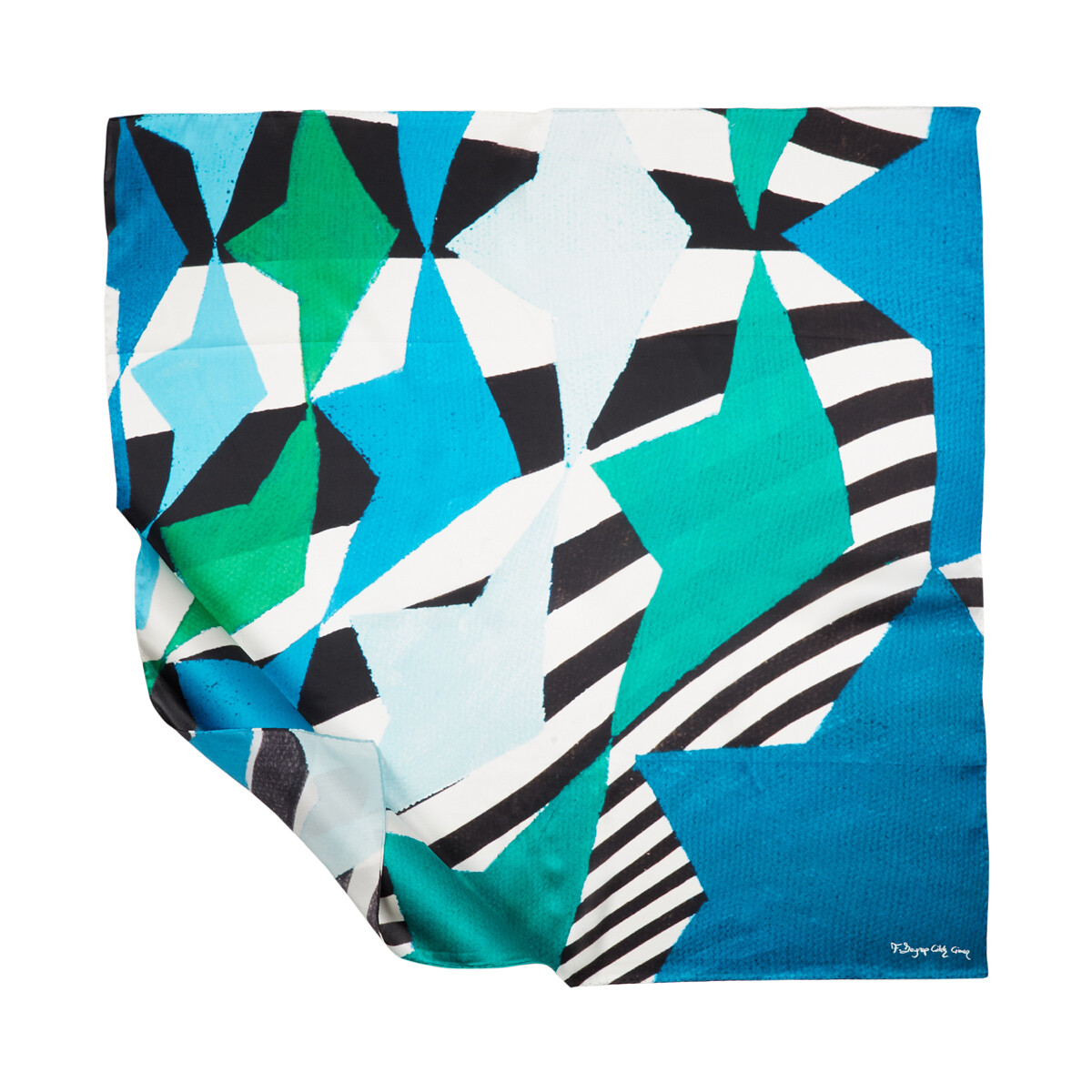 A square scarf in satin silk, digitally printed with the artwork Bridge by Turkish artist Fatma Zeynep Cilek.