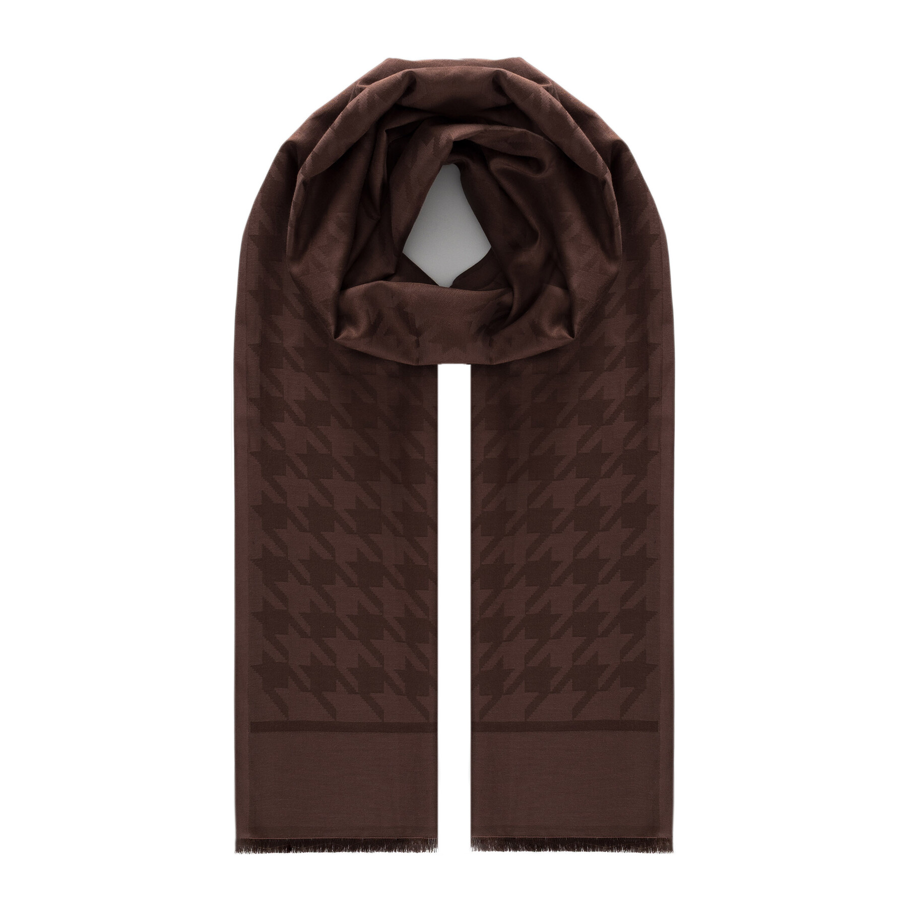 A brown cotton silk blend scarf highlighted with the timeless houndstooth pattern throughout.