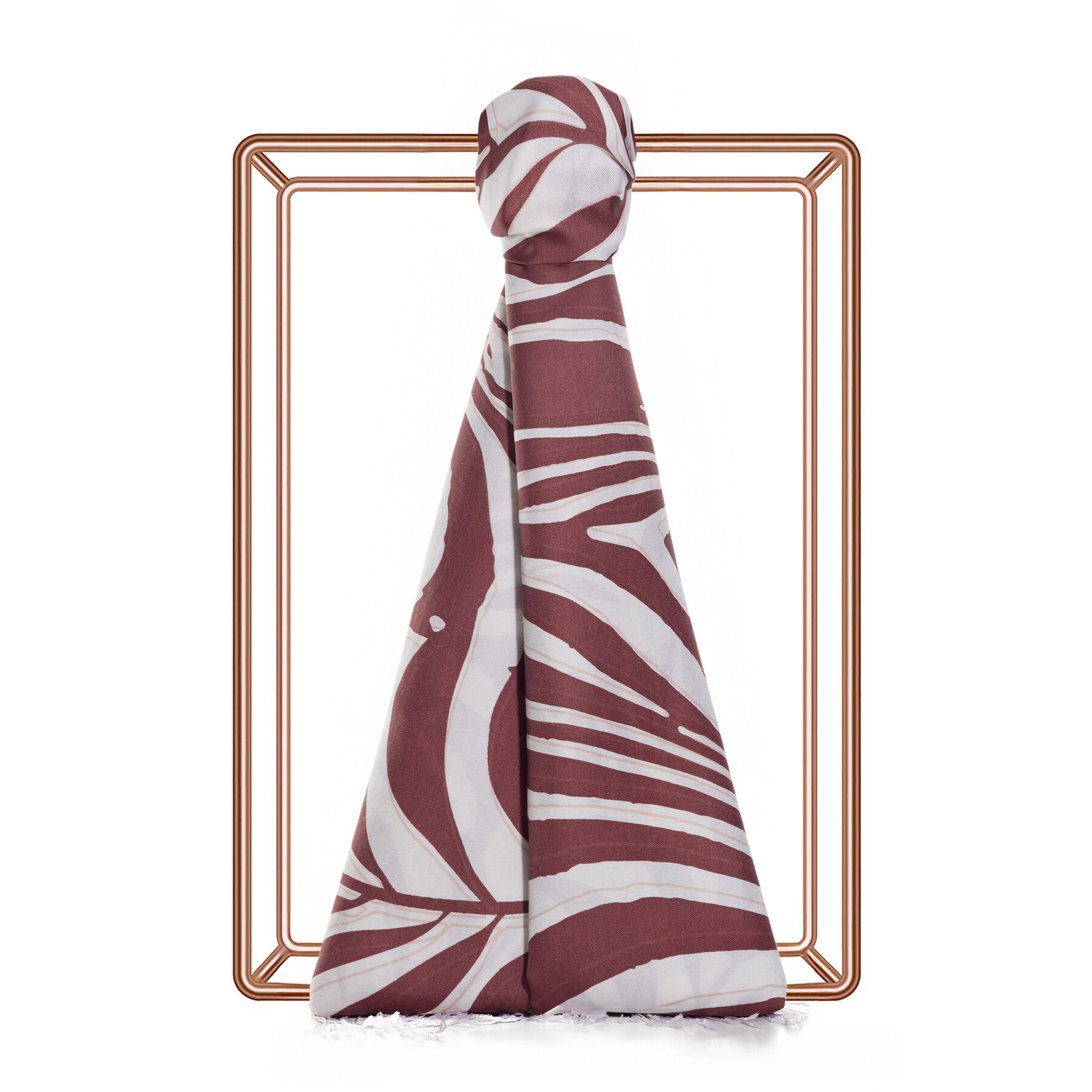 A white silk scarf highlighted with our tropical Palm Springs print throughout in brown.