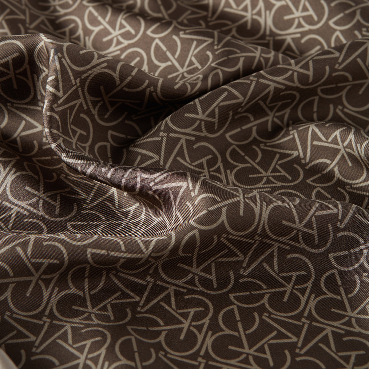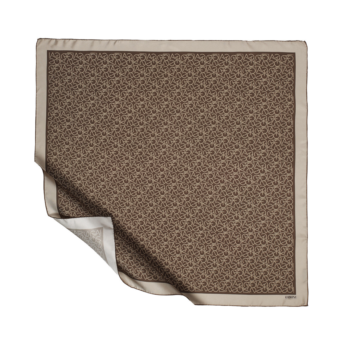 A brown square scarf in silk twill digitally printed with our unique Typo Pattern monogram.