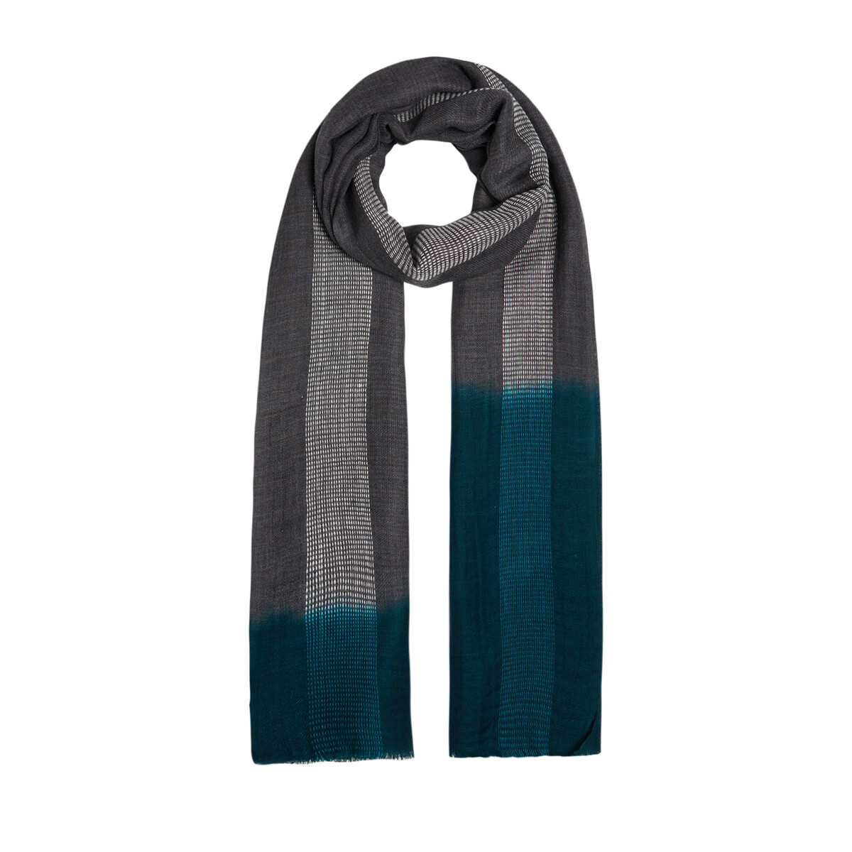 شال صوف وحرير تصميم خطوط مطرزة لون متدرج رمادي وبترولي