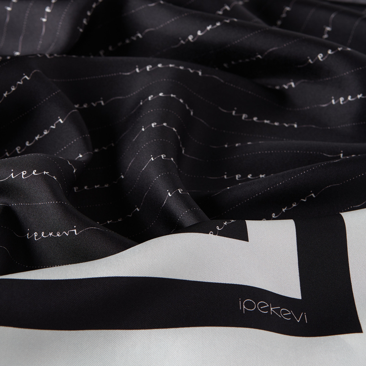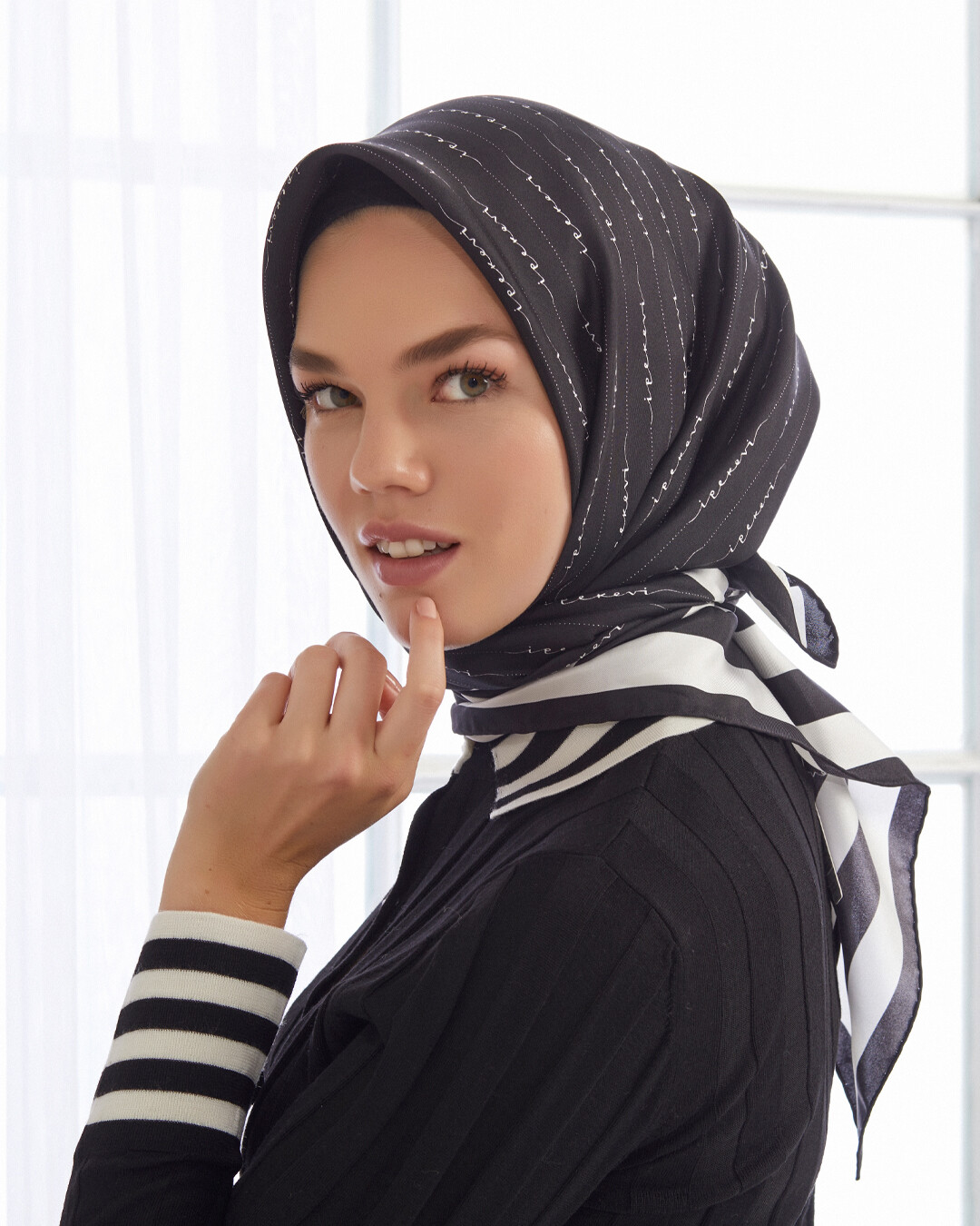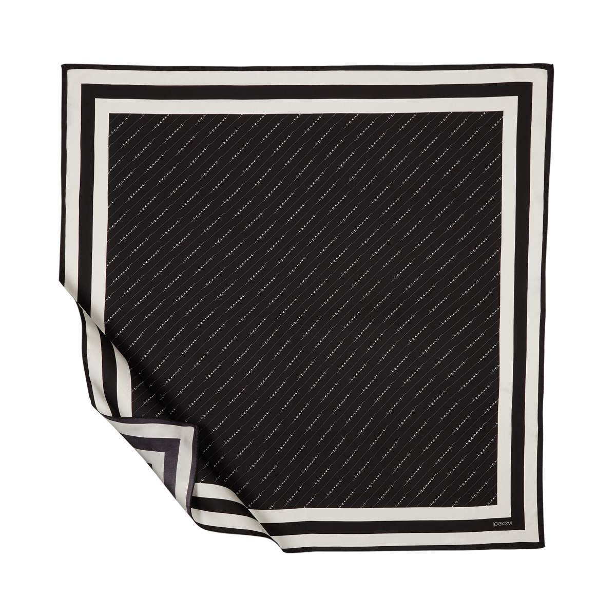ايشارب حرير تويل لون أسود مخطط بطبعة توقيع الماركة