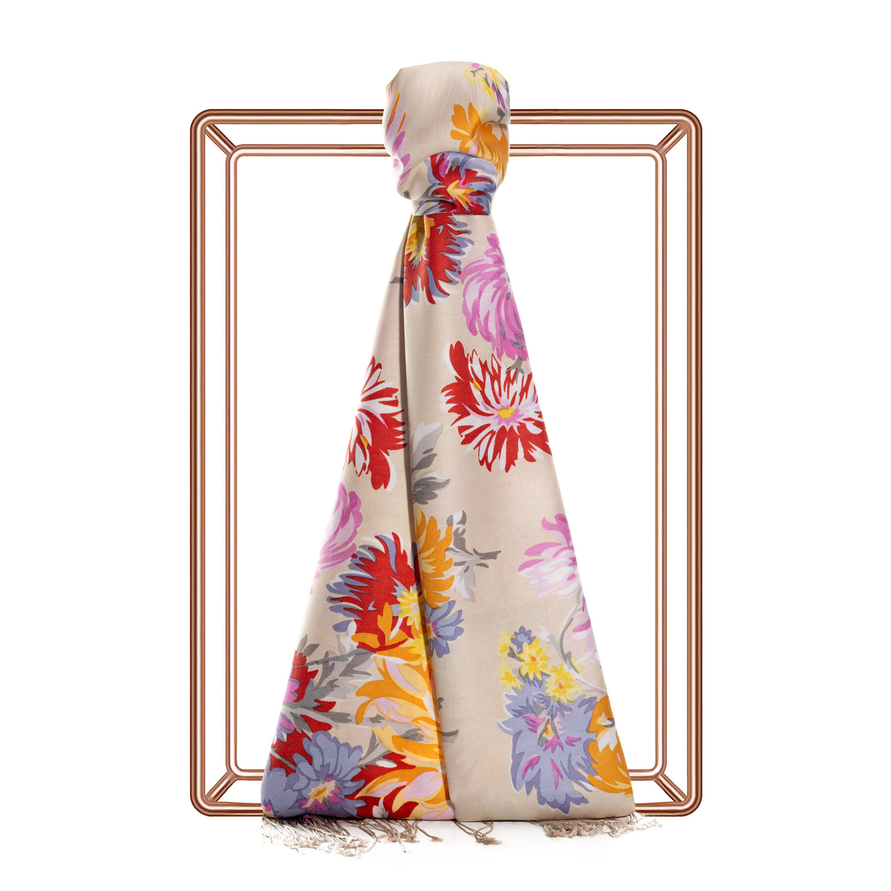 A cream silk scarf featured with our iconic Chrysanthemum print throughout.