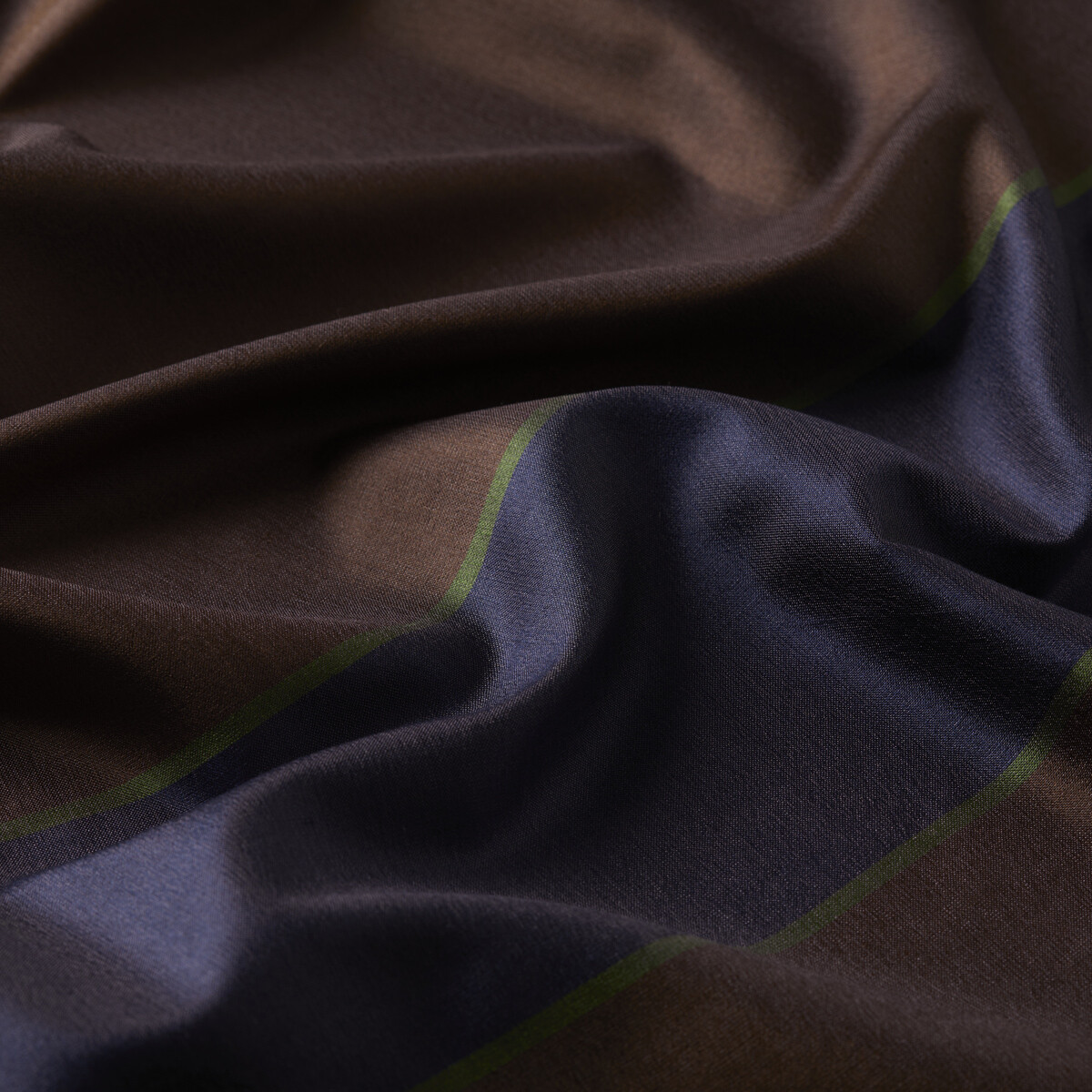 A silk scarf in dark brown, highlighted with a navy and walnut green block stripe at both ends.