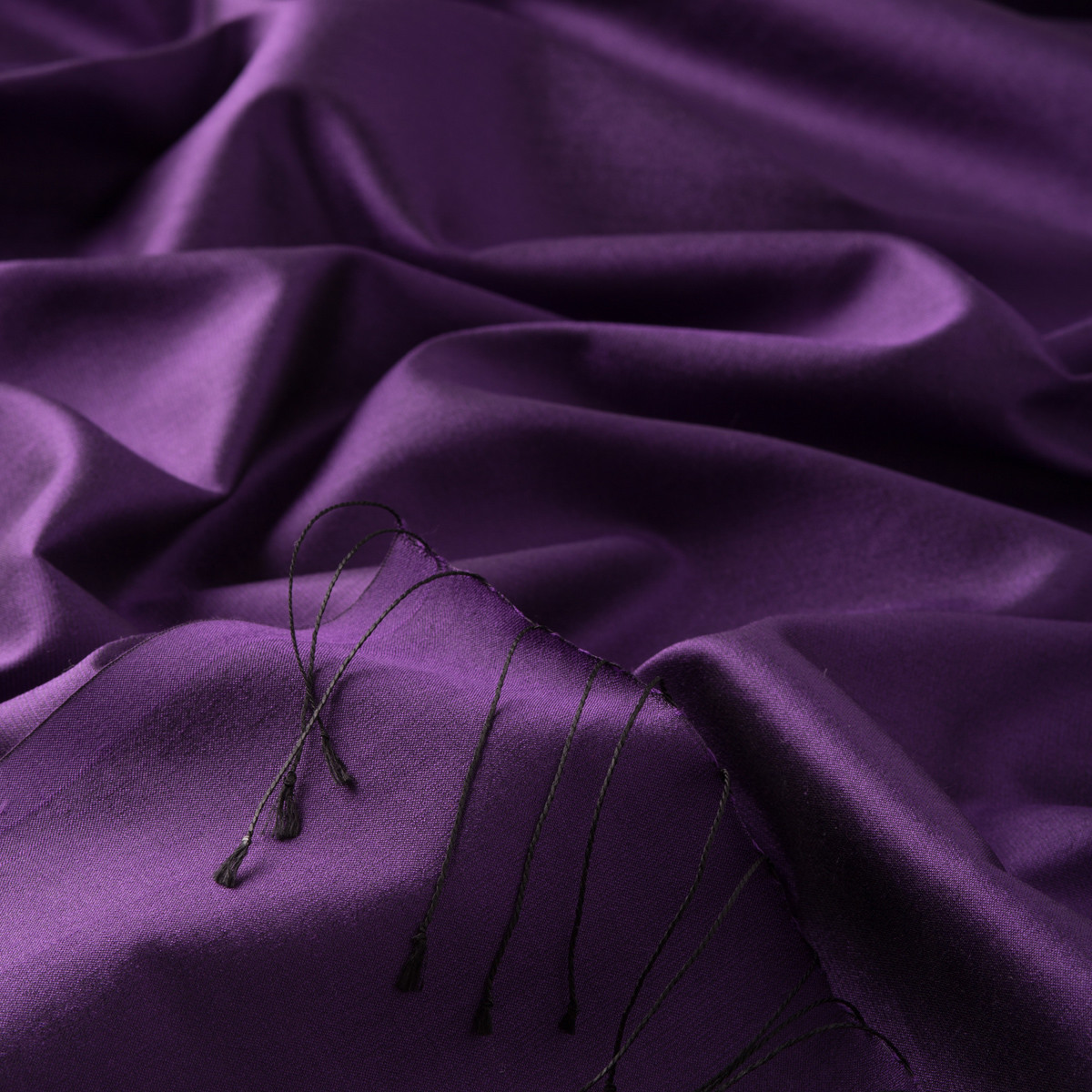 The classic Ipekevi plain silk scarf in Elegant Purple, finished with fine black fringes at both ends.