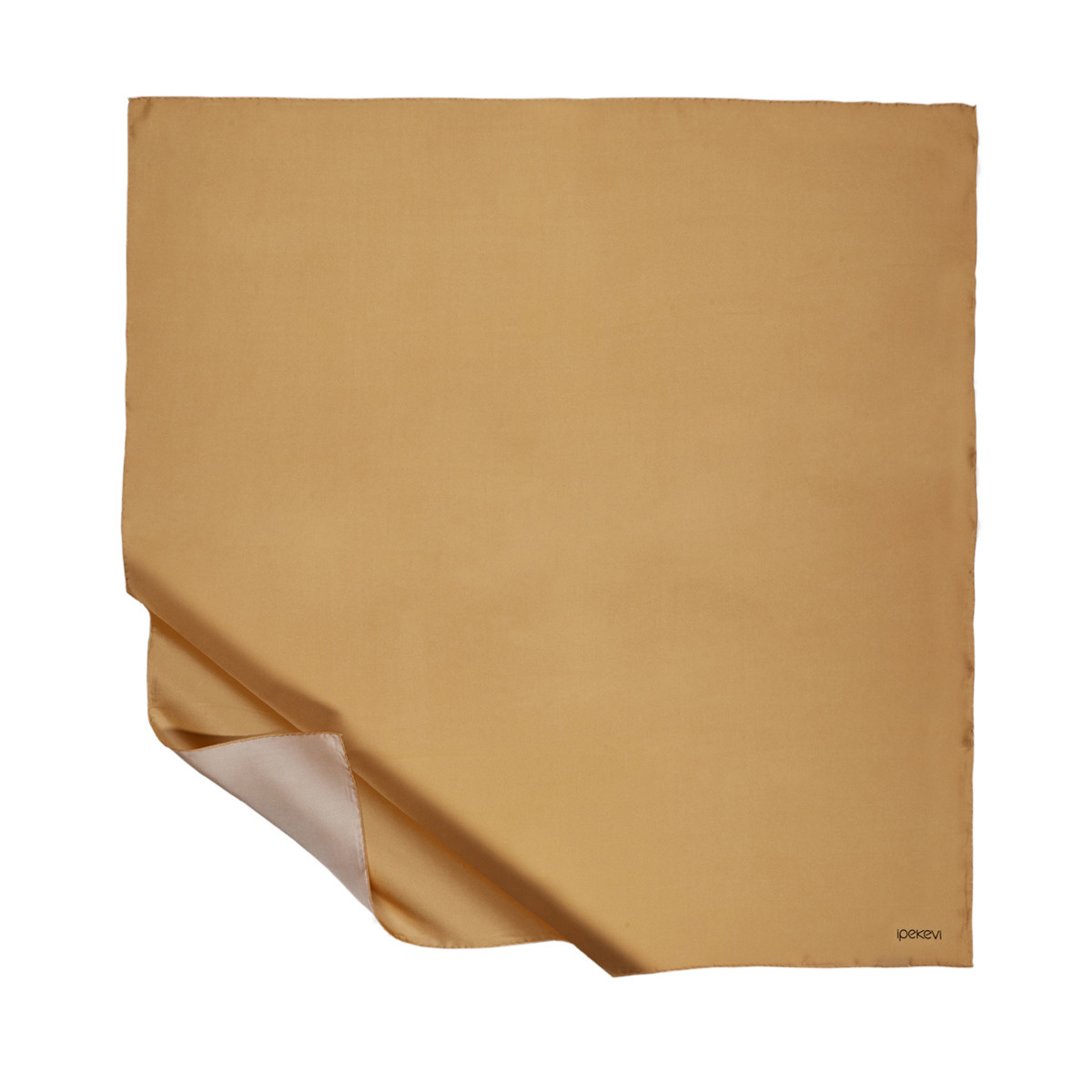 A gold square scarf in silk twill, featuring our logotype at the bottom right corner.