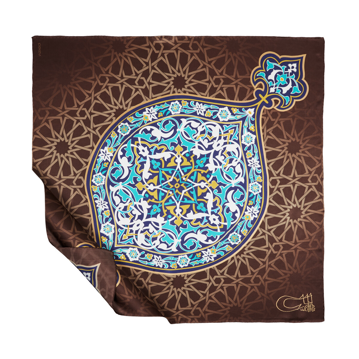 A satin silk square scarf, digitally printed with traditional Turkish motifs symbolizing the Green Tomb.