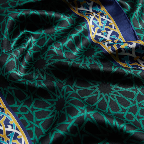 A satin silk oblong scarf, digitally printed with traditional Turkish motifs symbolizing the Green Tomb.