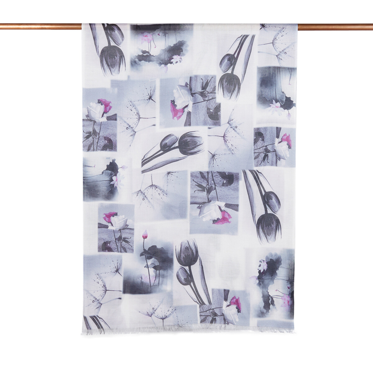 A silver blend scarf featured with our nostalgic Collage print throughout.