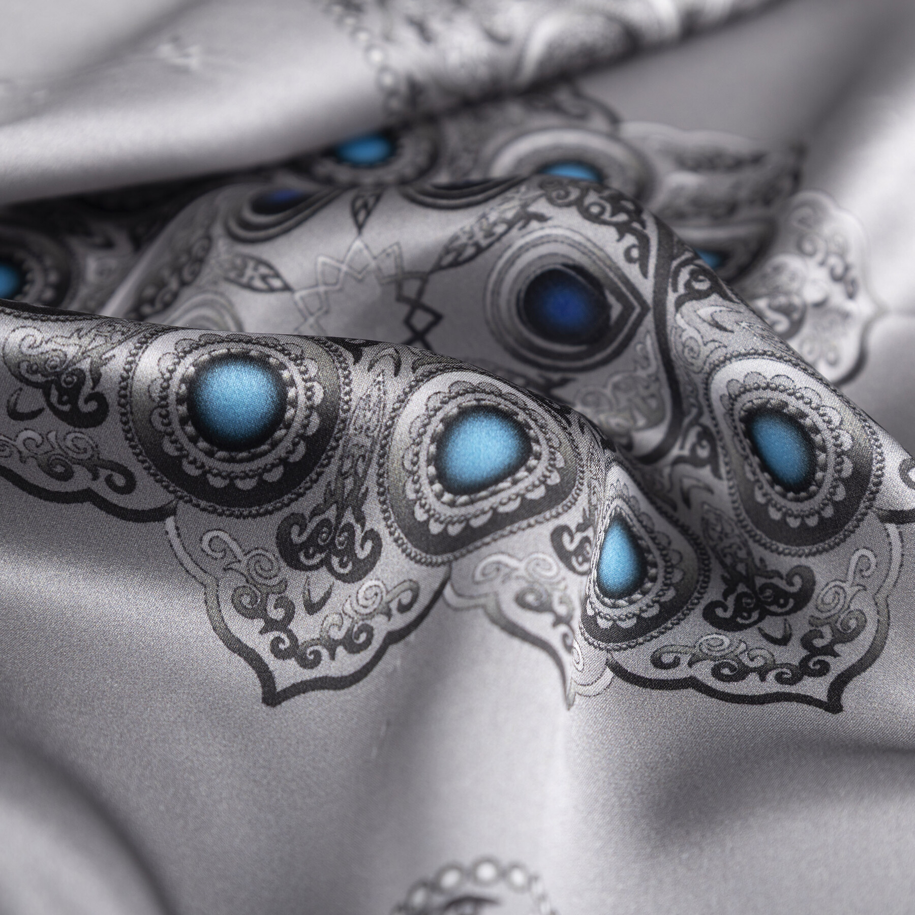 Telkari sanatının zarif mirasından ilham alan, geçmişin ince işçiliğini günümüz şıklığıyla buluşturuyor. Yüzyıllar boyunca özellikle Anadolu ve Mezopotamya’da gelişen telkari, gümüş tellerin sabırla işlenmesiyle ortaya çıkan adeta bir sanat eseri niteliği taşır. Bu eşsiz zanaatın incelikli motifleri, ipeğin pürüzsüz ve parlak dokusu üzerinde yeniden hayat buluyor.