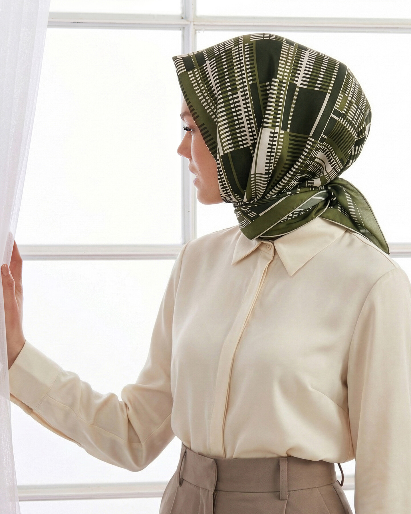 ايشارب حرير تويل تصميم هندسي لون أخضر عسكري