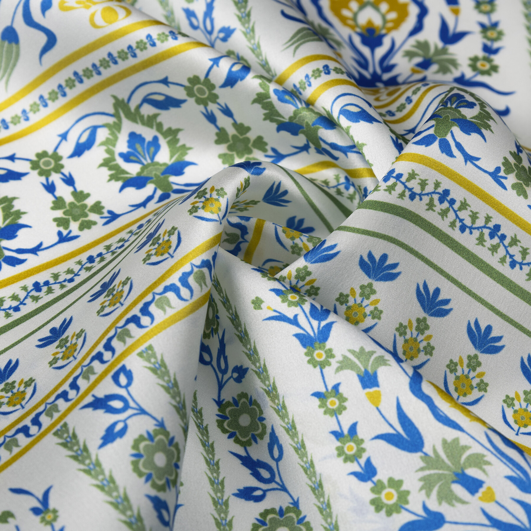 Geleneksel desen anlayışı, tivil ipeğin asil parlaklığı ve tok duruşuyla birleşerek eşarba derinlik ve karakter kazandırır. Yüzyıllar boyunca el sanatlarında kullanılan geometrik şebeke motifleri, ışıkla buluştuğunda zarif bir ihtişam sunar.