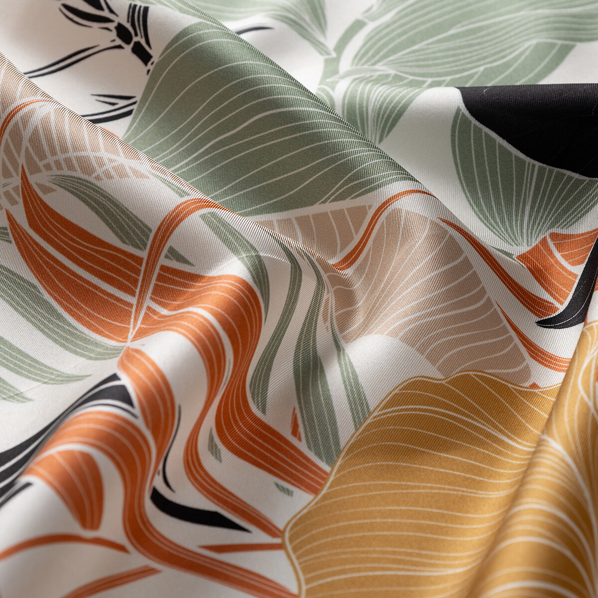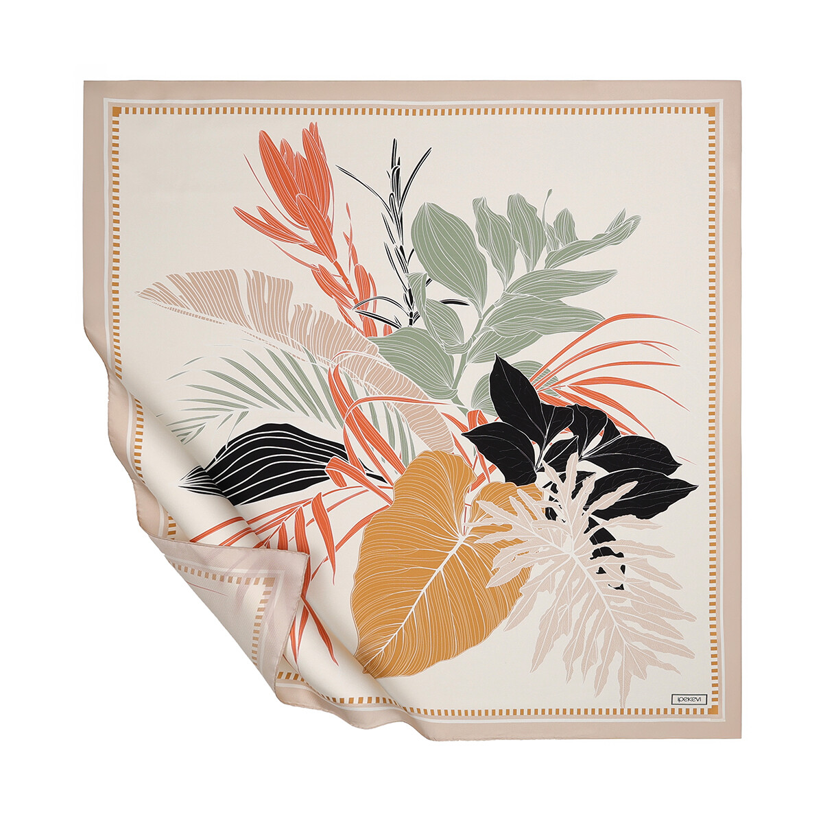 Doğanın renkleri ve tropikal bitkilerin enerjisi, Tropik Kanvas Tivil İpek Eşarp ile gardırobunuza hayat katıyor. Her detay, özgür ruhlara ve cesur tarzlara hitap ediyor. %100 İpek