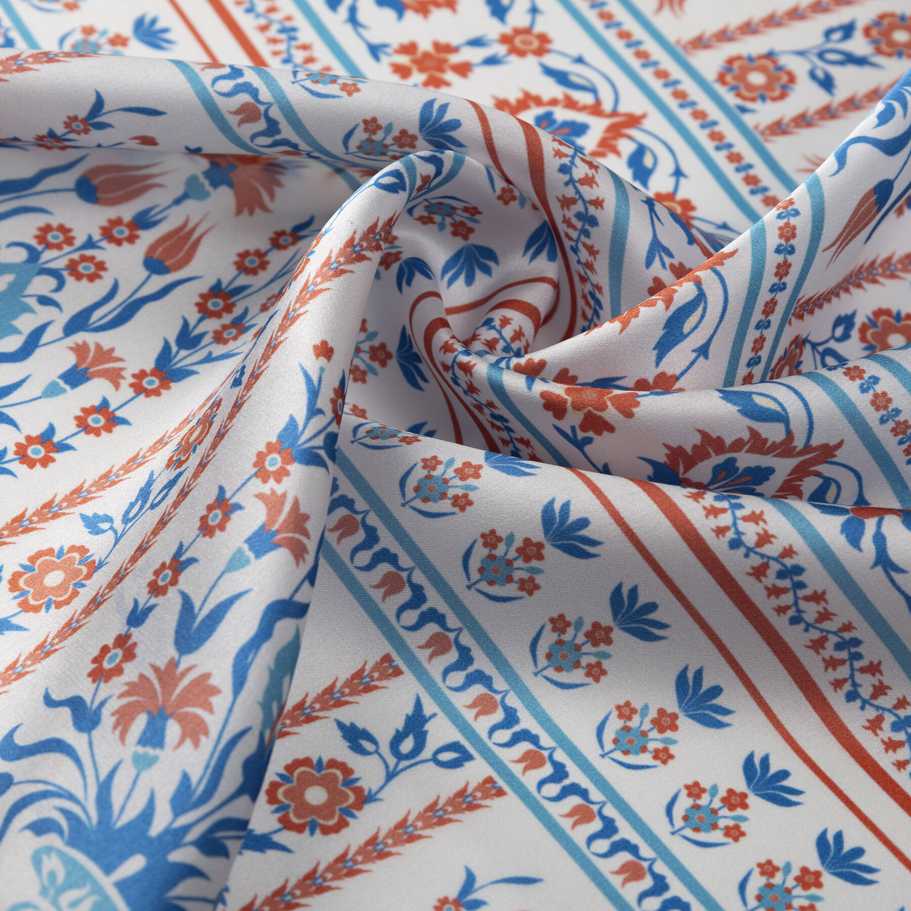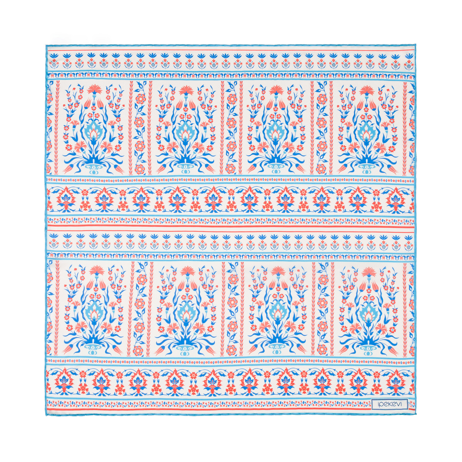 Geleneksel desen anlayışı, tivil ipeğin asil parlaklığı ve tok duruşuyla birleşerek eşarba derinlik ve karakter kazandırır. Yüzyıllar boyunca el sanatlarında kullanılan geometrik şebeke motifleri, ışıkla buluştuğunda zarif bir ihtişam sunar.