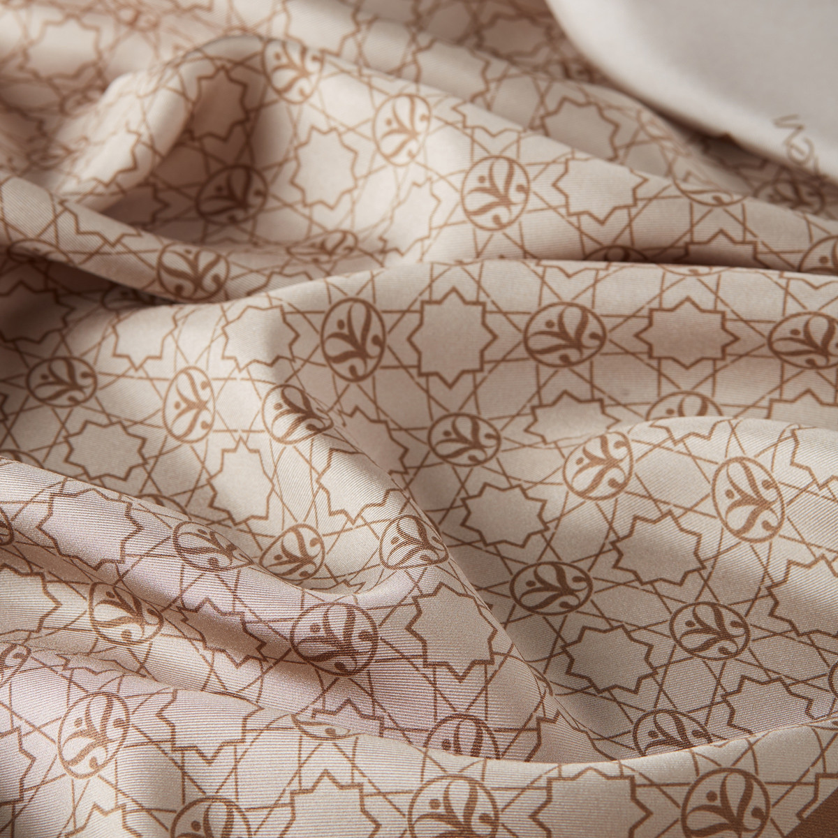 A silver mink square scarf in silk twill digitally printed with our iconic Seljuk monogram in miniature form.