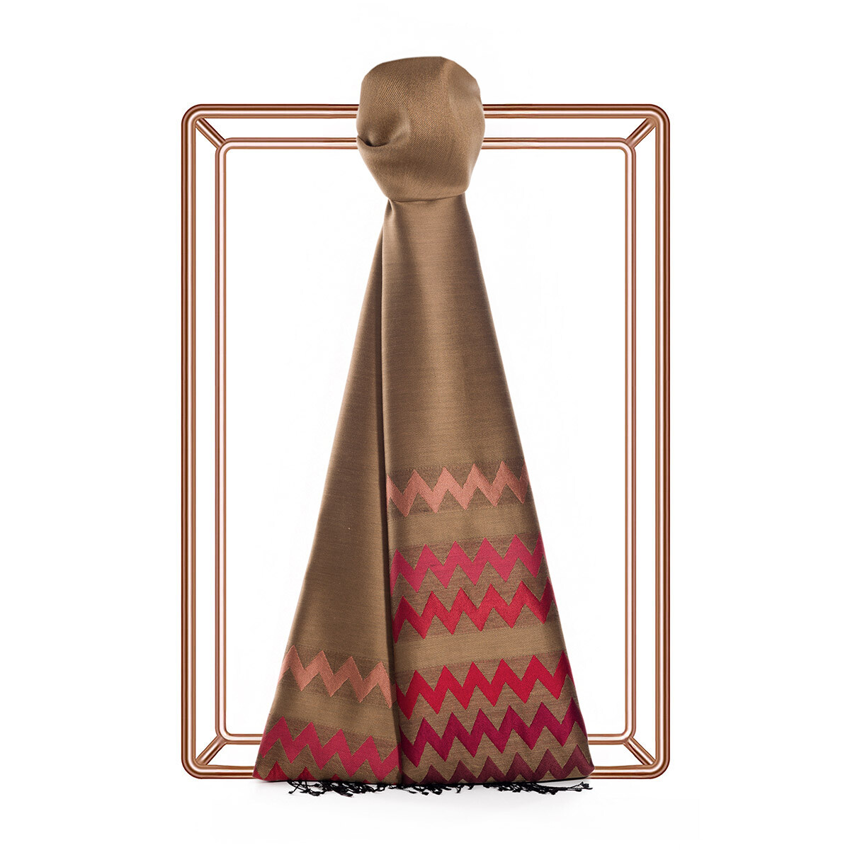 A reversible milky coffee silk scarf featured with six zigzags in orange shades at both ends.