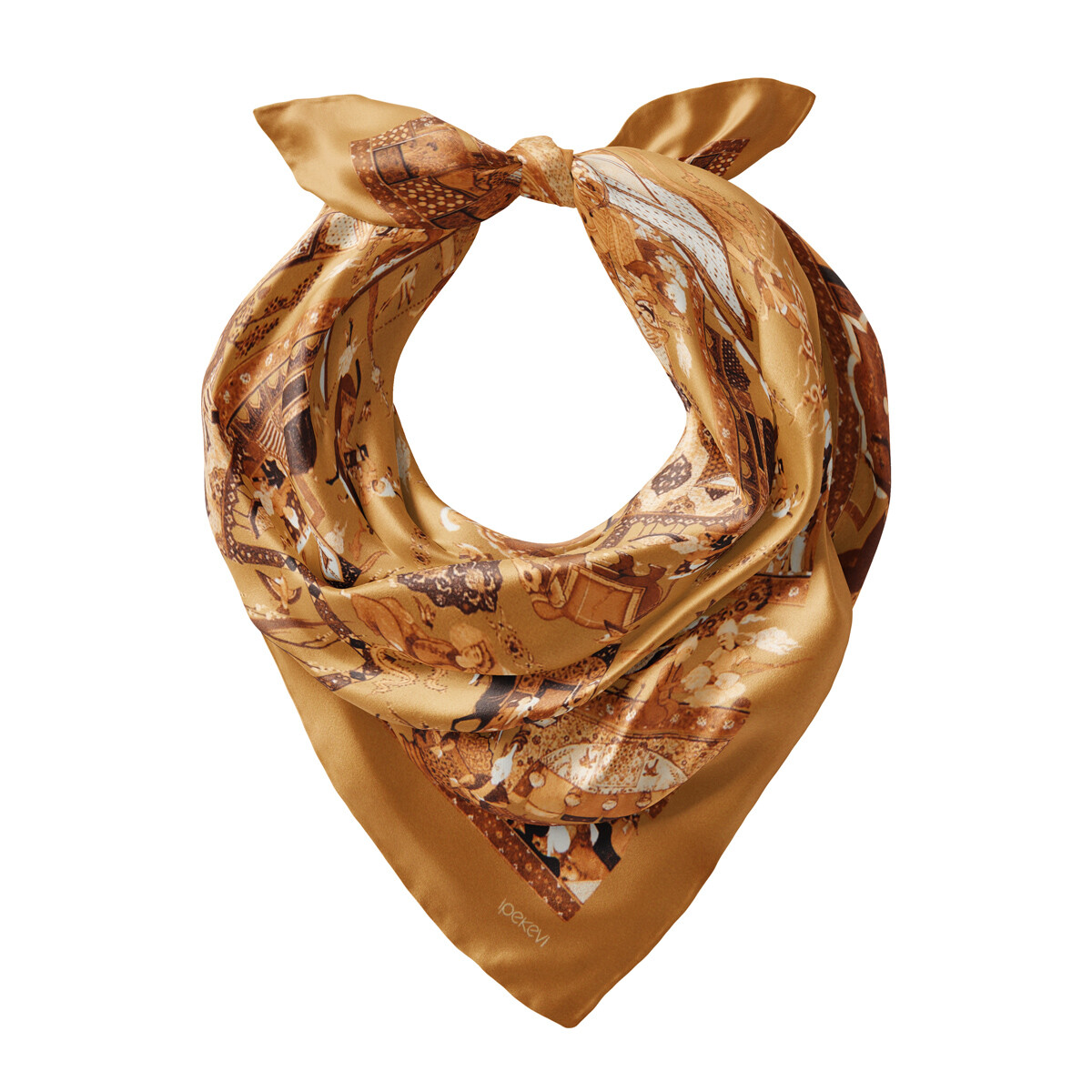 A gold pocket square in satin silk digitally printed with our unique and detailed Miniature print.
