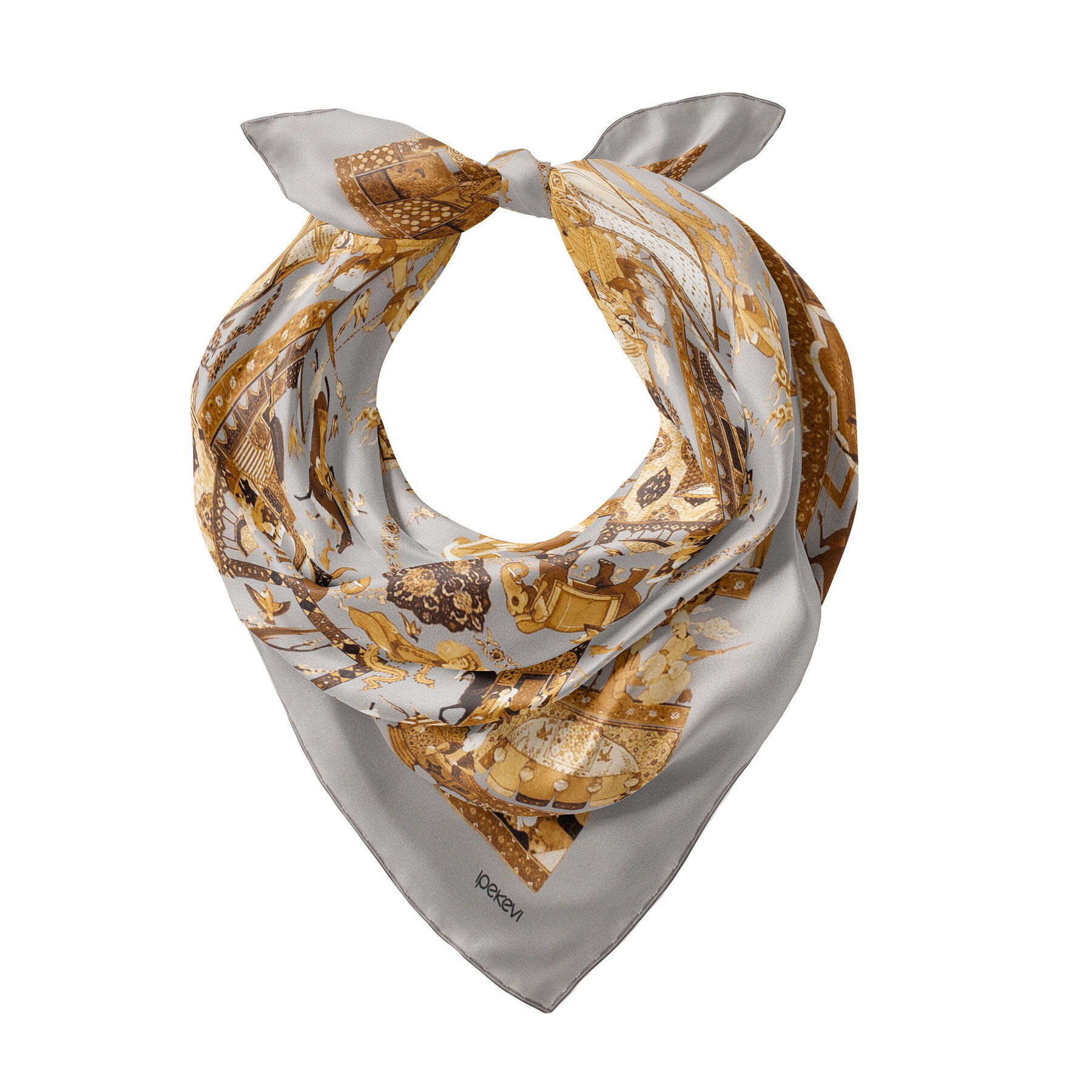 A silver pocket square in satin silk digitally printed with our unique and detailed Miniature print.
