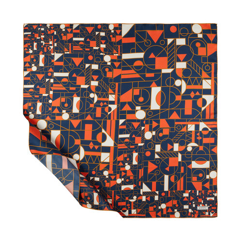 Navy Blue Orange Mosaic Patterned Twill Silk Scarf