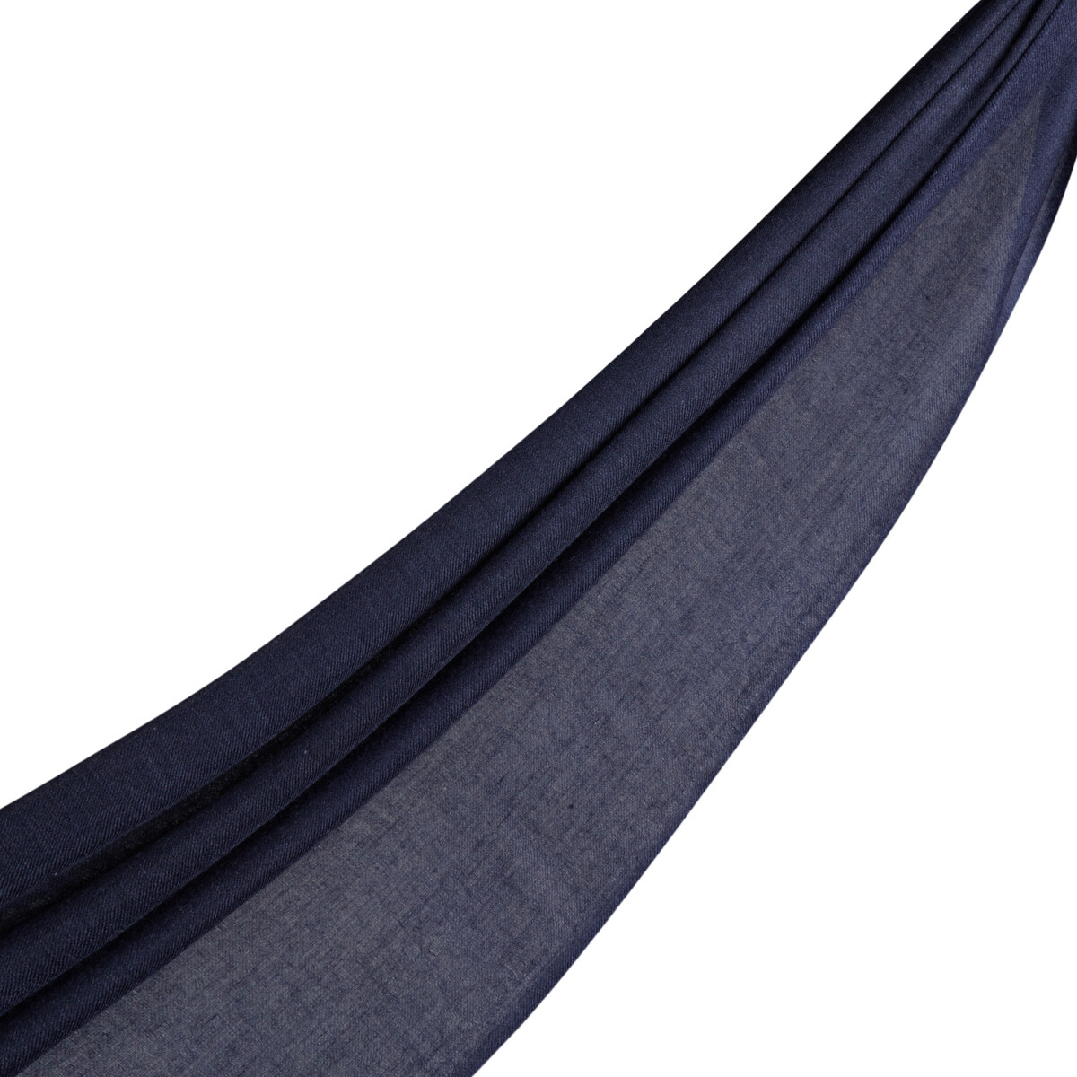 A plain navy scarf crafted from precious wool, cashmere, and mulberry silk.