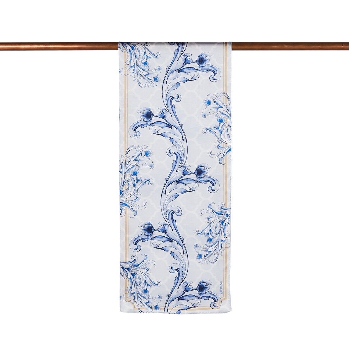 A satin silk oblong scarf, digitally printed with traditional Turkish motifs symbolizing Nicaea.