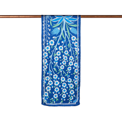 A satin silk oblong scarf, digitally printed with traditional Turkish motifs symbolizing Nicaea.