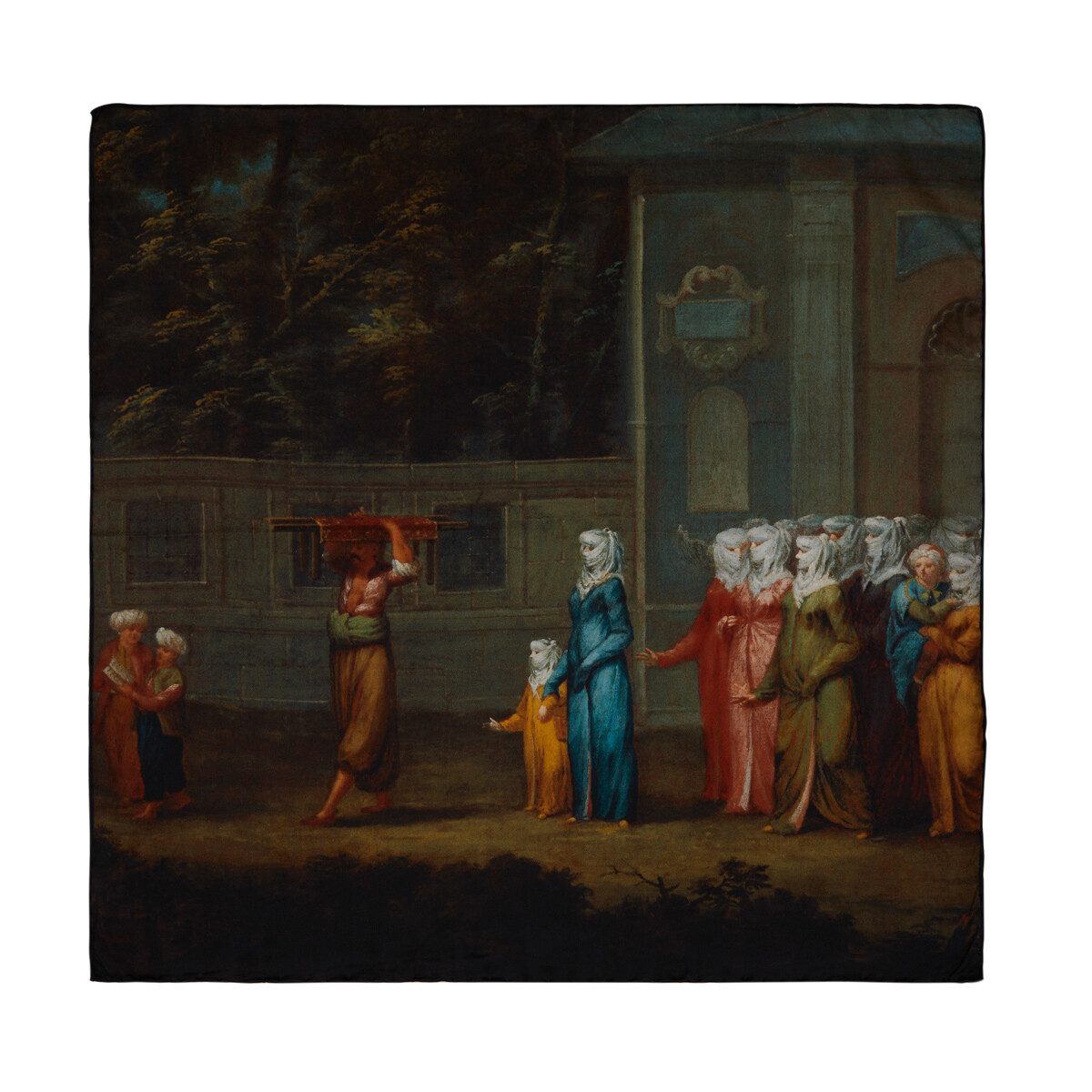 تظهر لوحات جان بابتيست فانمور أن الفن والوثائقي في وئام. وفي لوحة "أول يوم دراسي" تظهر أم وهي تصطحب ابنتها إلى المدرسة مع مجموعة من النساء، بلمسات ساذجة وألوان نابضة بالحياة. وفقًا لقواعد اللباس في تلك الفترة، كانت ترتدي النعال الصفراء والملابس الملونة فقط من قبل النساء المسلمات في الأماكن العامة. ويفهم من إطار التطريز الذي يحمله أن الفتاة الصغيرة ذهبت إلى صف التطريز. في الصورة أطفال يذهبون إلى مدرسة الصبيان وفي أيديهم كتب. 100% حرير 50x50 سم