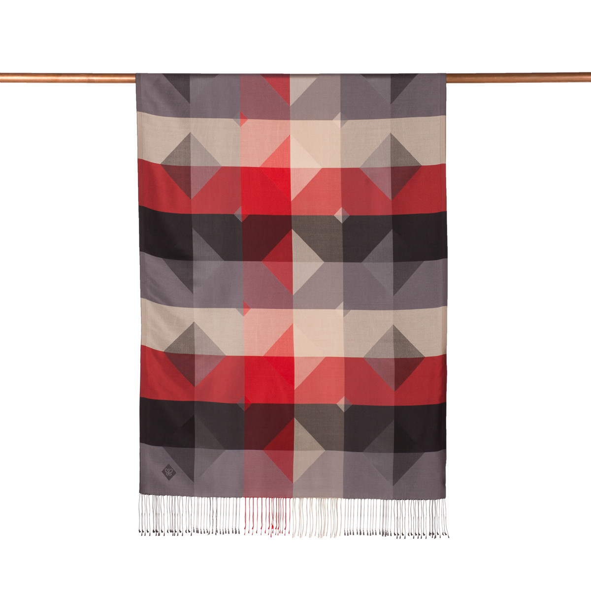 A reversible silk scarf featured with geometric patterns in red, gray, black and beige.