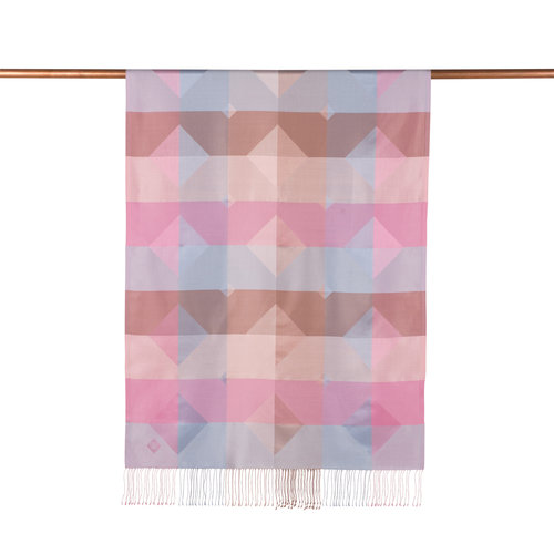 A reversible silk scarf featured with geometric patterns in sweet shades of brown, cream, pink and blue.