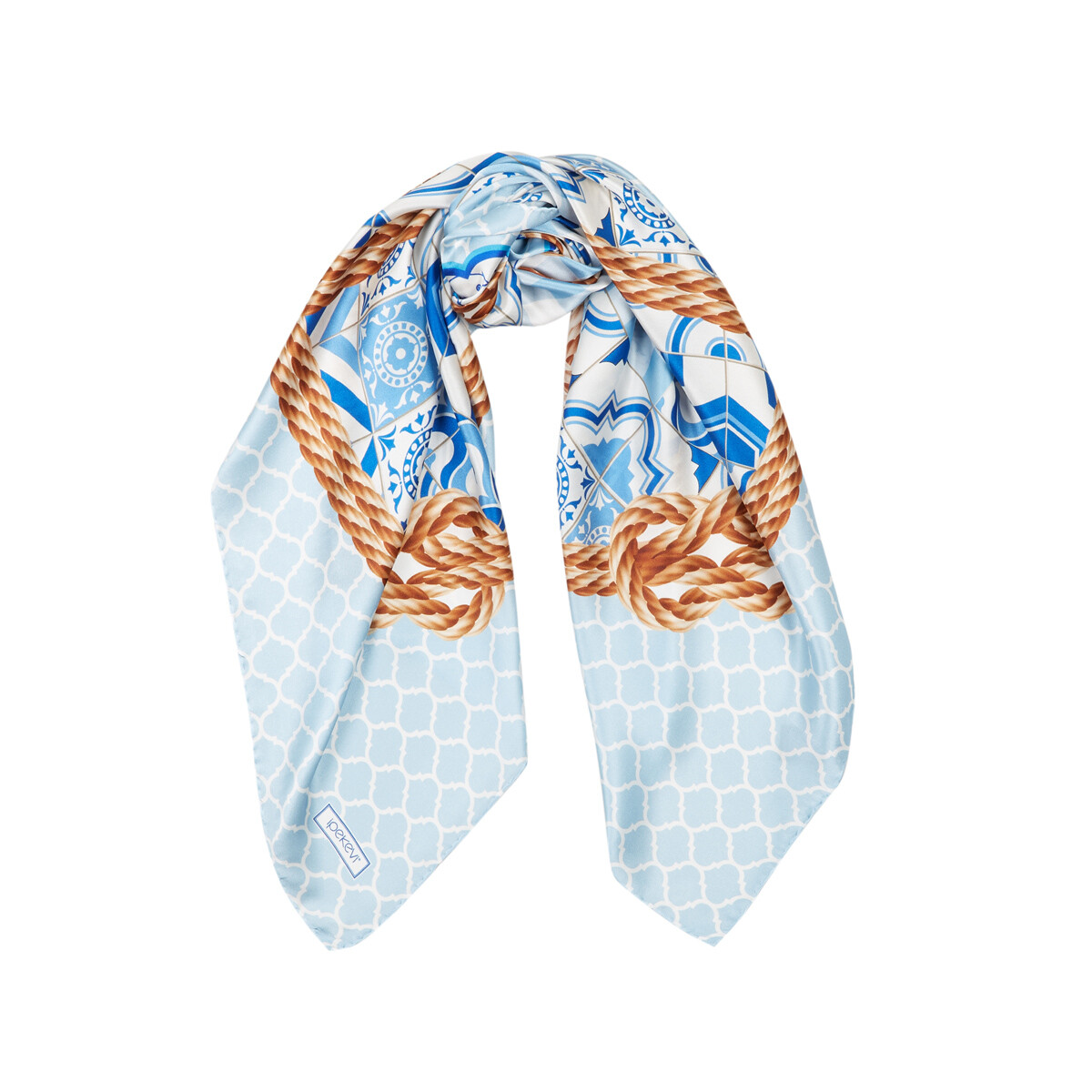 A baby blue square scarf in silk twill digitally printed with modern interpretations of traditional İznik ornaments and rope patterns.