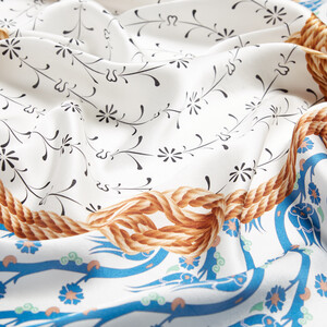 A silver square scarf in satin silk digitally printed with three continuous Turkish patterns symbolizing Nicaea.