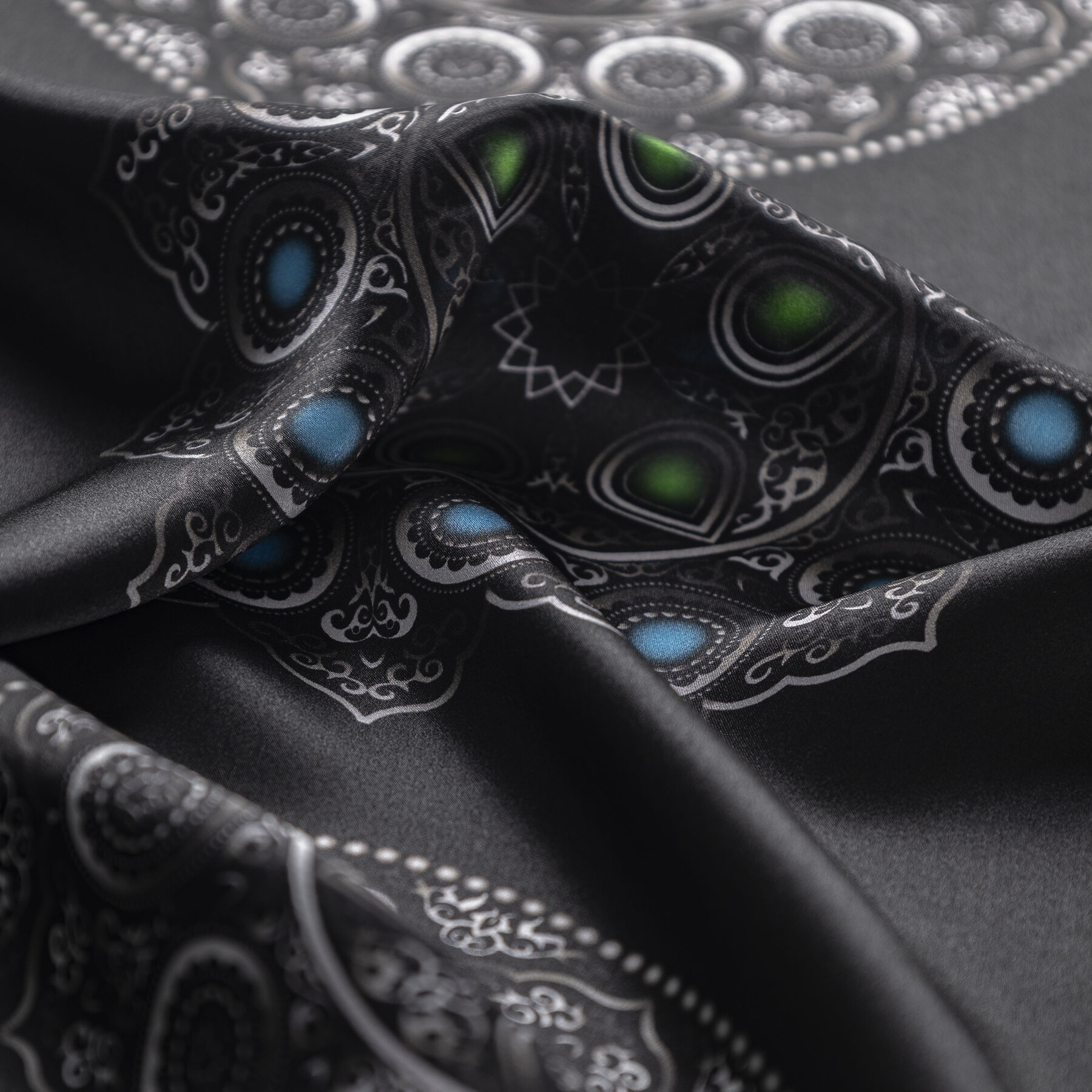 Telkari sanatının zarif mirasından ilham alan, geçmişin ince işçiliğini günümüz şıklığıyla buluşturuyor. Yüzyıllar boyunca özellikle Anadolu ve Mezopotamya’da gelişen telkari, gümüş tellerin sabırla işlenmesiyle ortaya çıkan adeta bir sanat eseri niteliği taşır. Bu eşsiz zanaatın incelikli motifleri, ipeğin pürüzsüz ve parlak dokusu üzerinde yeniden hayat buluyor.
