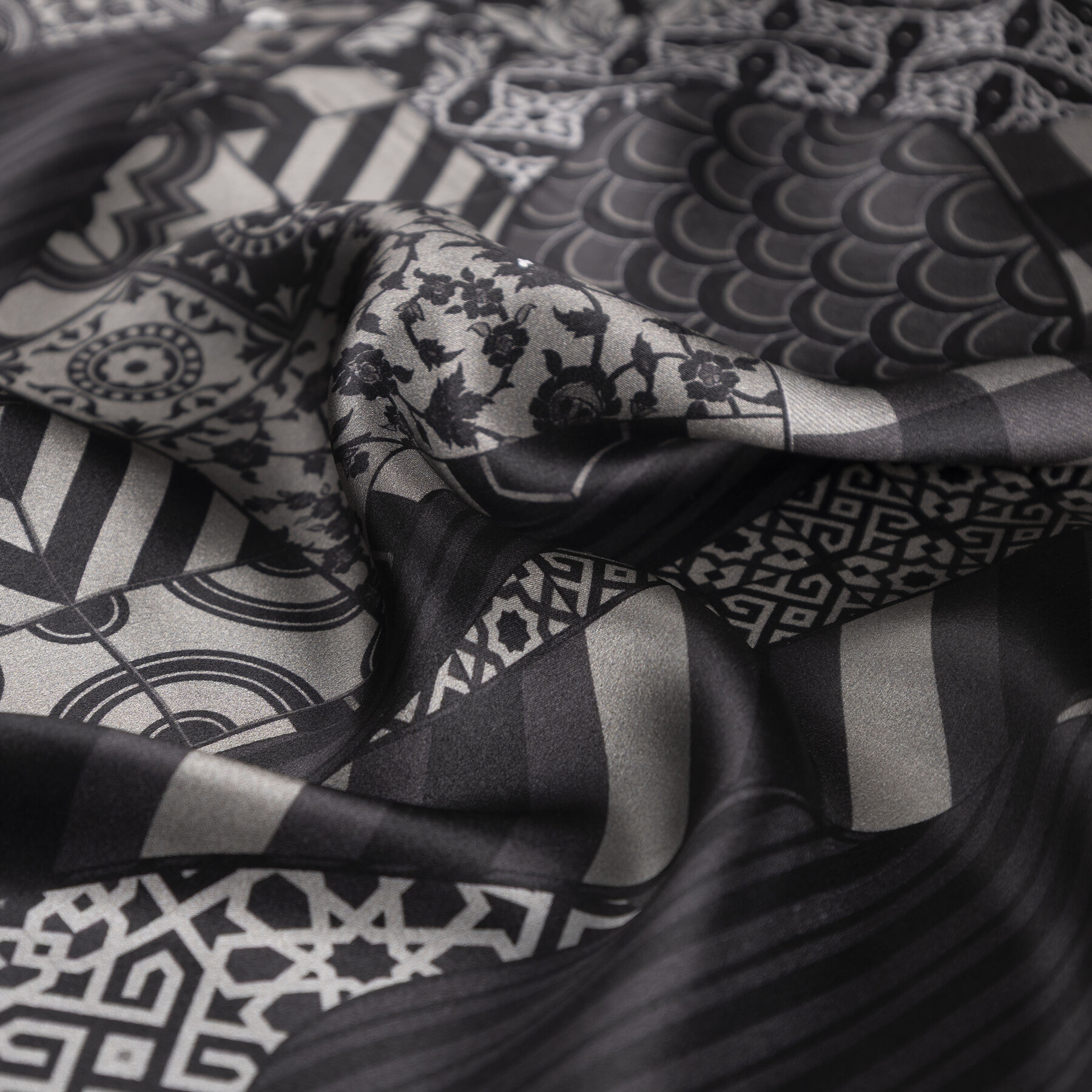 A black pocket square in satin silk digitally printed with our colourful and detailed Sultan’s Caftan print.