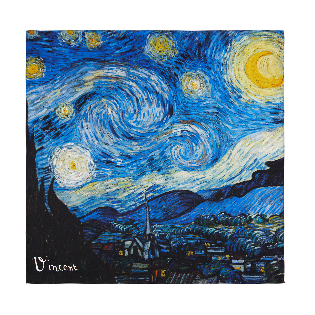 A pocket square in satin silk, digitally printed with Vincent van Gogh's world renowned painting: The Starry Night.