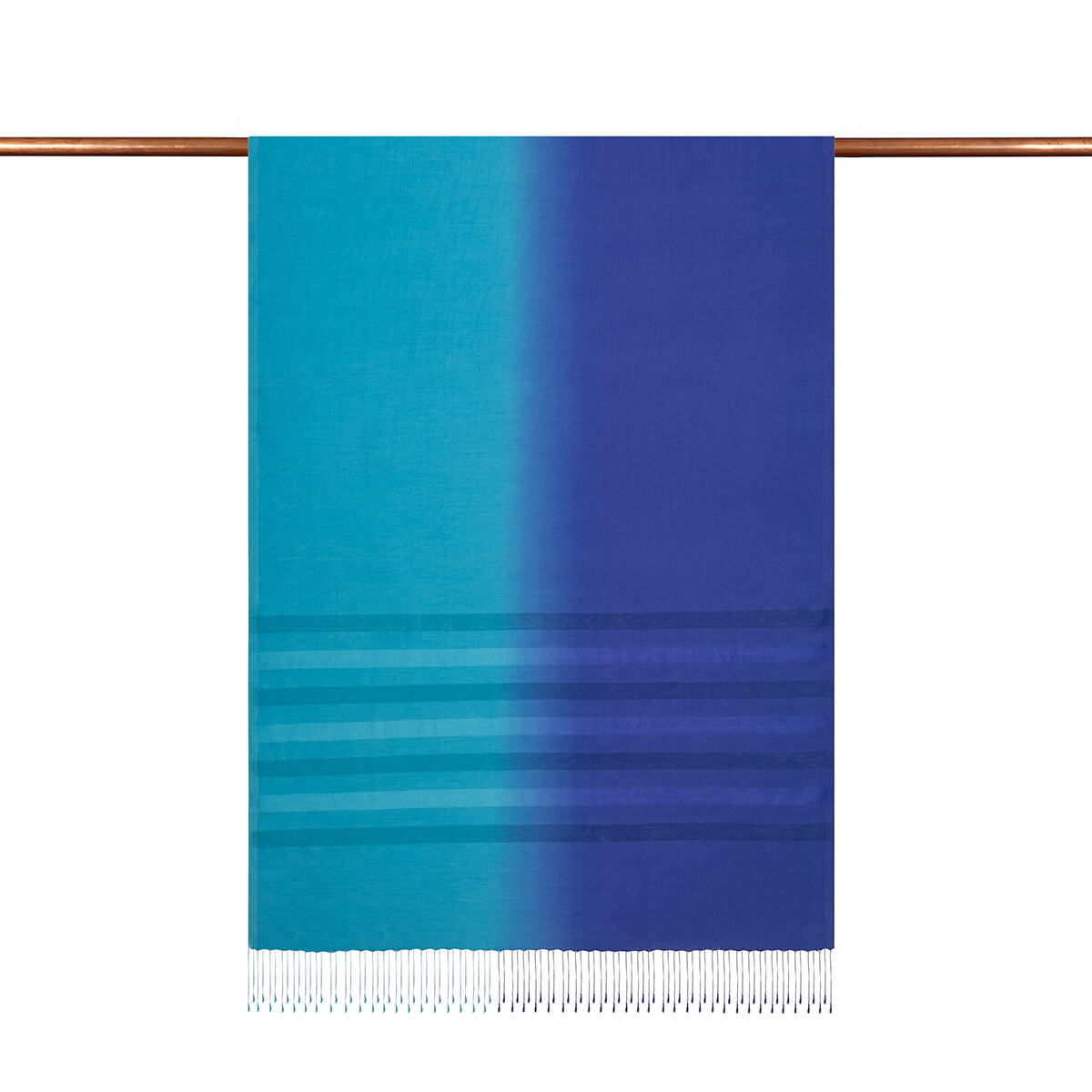 A turquoise gradient silk shawl, featuring mono stripes and fringe finishing at both ends.