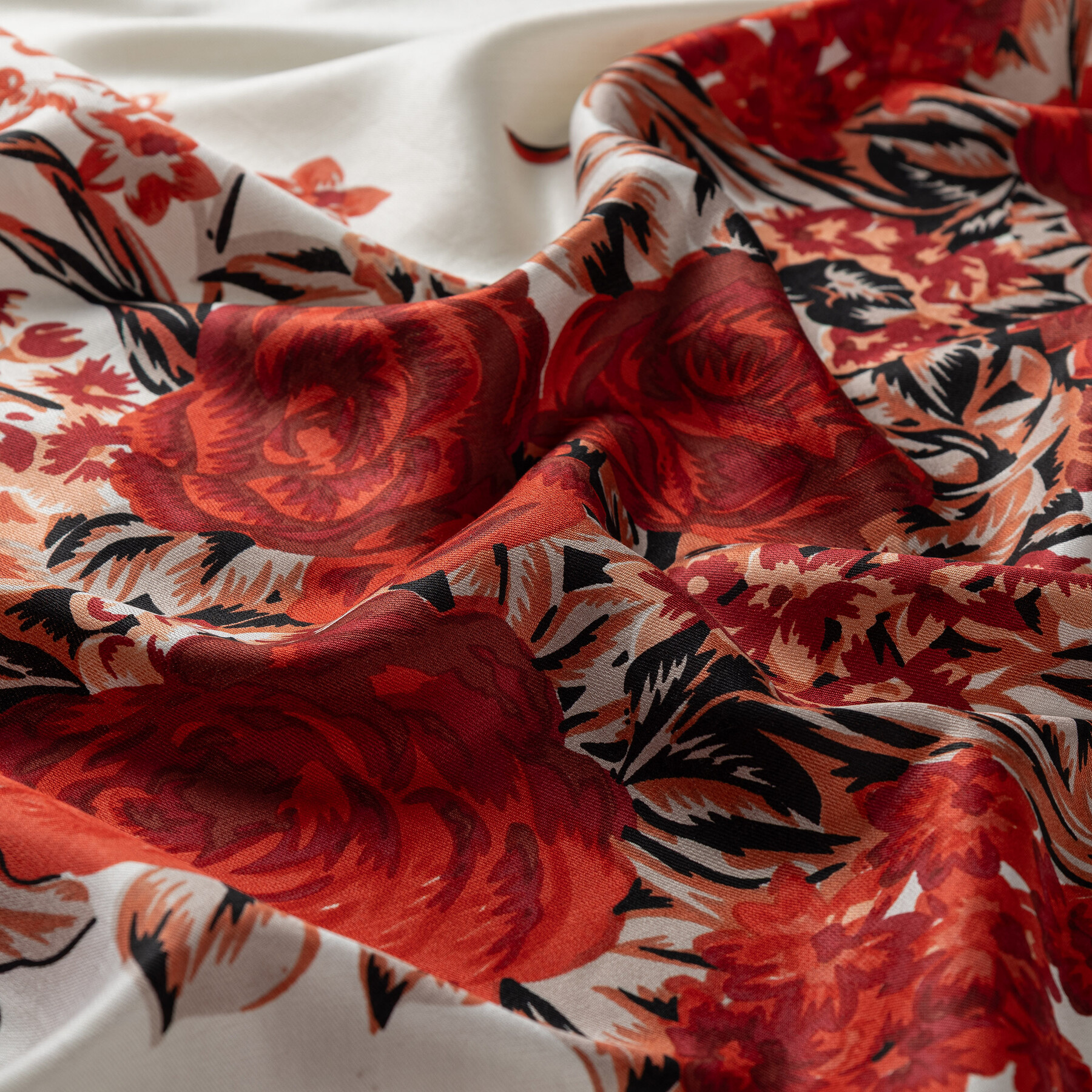 شال حرير بتصميم ورود لون أبيض وأحمر